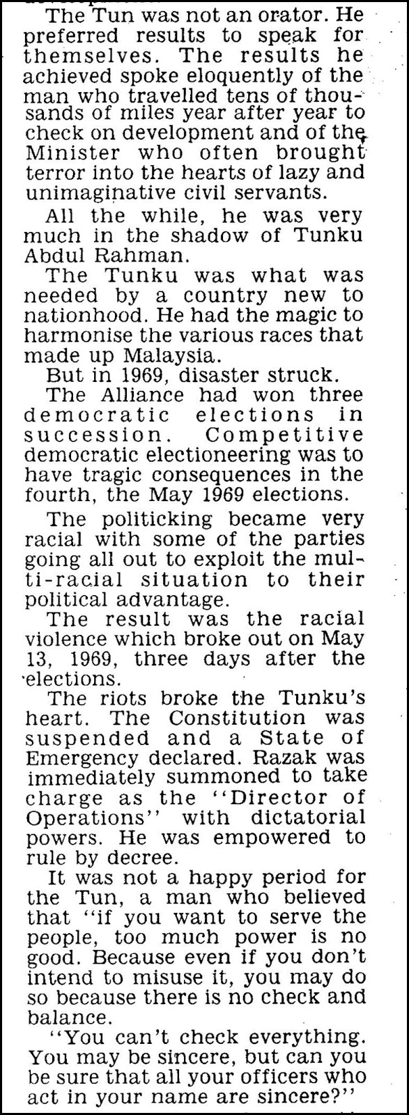 When I was in Singapore University during the mid-60s, my (Chinese) fellow undergrads labelled Tun Razak a racist , but they all agreed that he was made of sterner stuff than Tengku Abdul Rahman and would be a formidable leader of Malaysia.